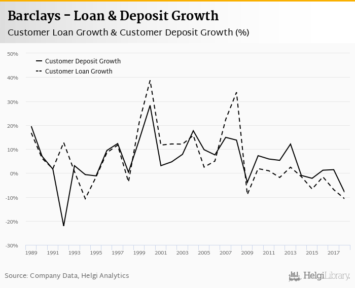 Barclays's customer loan growth reached -10.7% in 2018, down from -6.93% compared to the previous year. Historically, the bank’s loans growth reached an all time high of 38.7% in 2000 and an all time low of -10.7% in 2018. In the last decade, the average annual loan growth amounted to -3.41%.