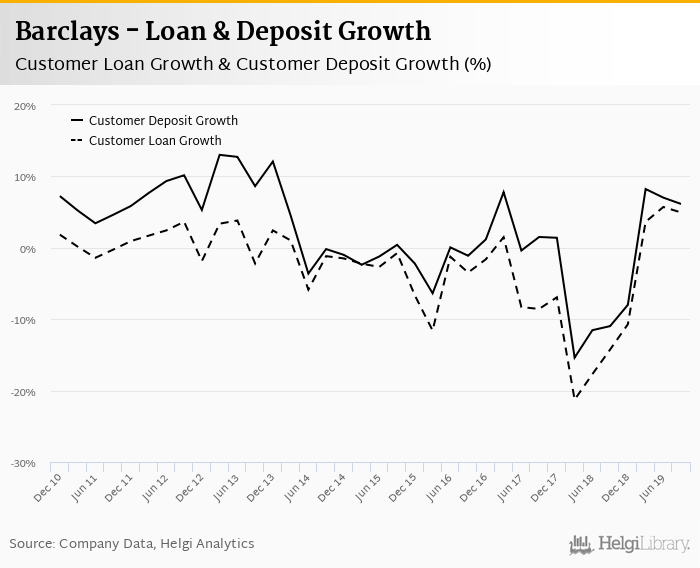 Barclays's customer loan growth reached 4.94% in 2019-09-30, up from -14.3% compared to the previous year. Historically, the bank’s loans growth reached an all time high of 5.72% in 2019-06-30 and an all time low of -21.3% in 2018-03-31. In the last decade, the average annual loan growth amounted to 0%.