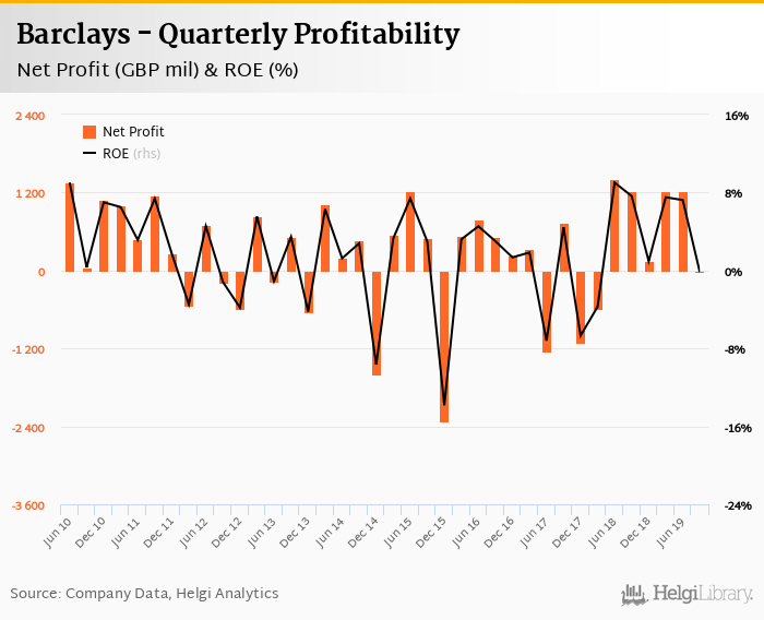 Barclays made a net profit of GBP -27.0 mil in the third quarter of 2019, down 102% when compared to the same period of last year. This implies a return on equity of -0.159%.