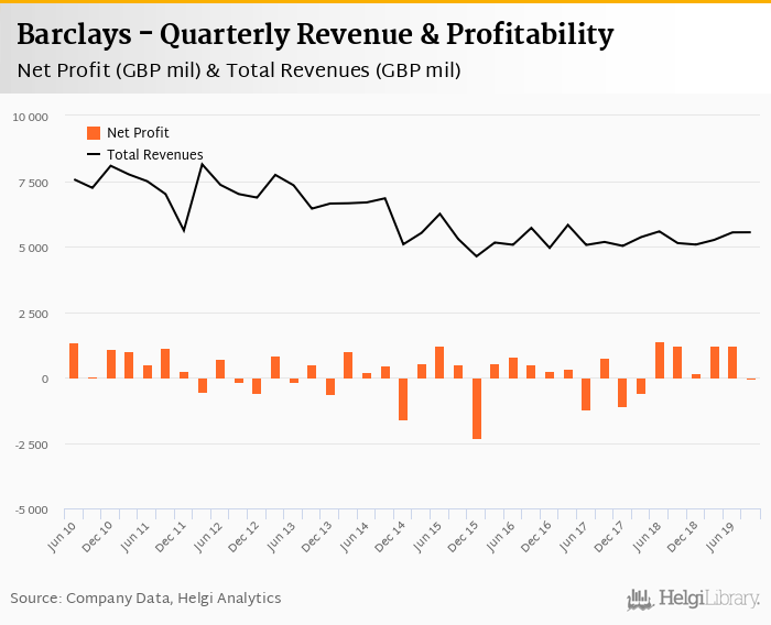Barclays made a net profit of GBP -27.0 mil under revenues of GBP 5,541 mil in the third quarter of 2019, down 102% and up 8.03% respectively when compared to the same period last year.