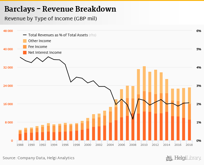 Barclays generated total banking revenues of GBP 23,220 mil in 2018, up 0.899% compared to the previous year.