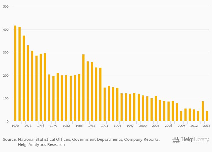 Historically, barytes production in Germany reached an all time high of 416 kt in 1970 and an all time low of 45.3 kt in 2015.