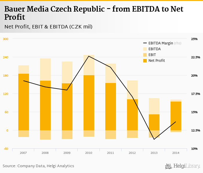 Bauer Media Czech Republic made a net profit of CZK 94.5 mil with revenues of CZK 698 mil in 2014, up by 79.5% and down by 3.5%, respectively, compared to the previous year. This translates into a net margin of 13.5%.