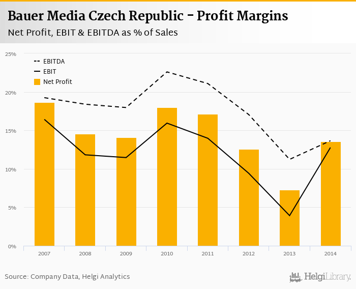 Bauer Media Czech Republic made a net profit of CZK 94.5 mil with revenues of CZK 698 mil in 2014, up by 79.5% and down by 3.5%, respectively, compared to the previous year.