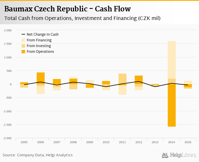 Baumax Czech Republic's operating cash flow stood at CZK -117 mil in 2016, up 0% when compared to the previous year. Historically, between 2005 - 2016, the firm’s operating cash flow reached a high of CZK 430 mil in 2006 and a low of CZK -1,579 mil in 2014.
