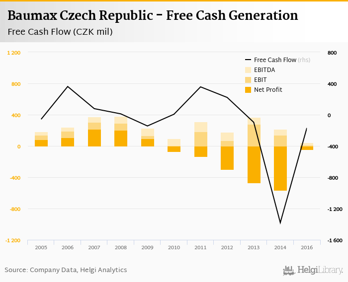 The company generated cash, defined by a sum of net profit and depreciation, of CZK -14.0 mil or -0.652% of sales. When investments are excluded, free cash flow reached CZK -170 mil, or -7.89% of sales in 2016.
