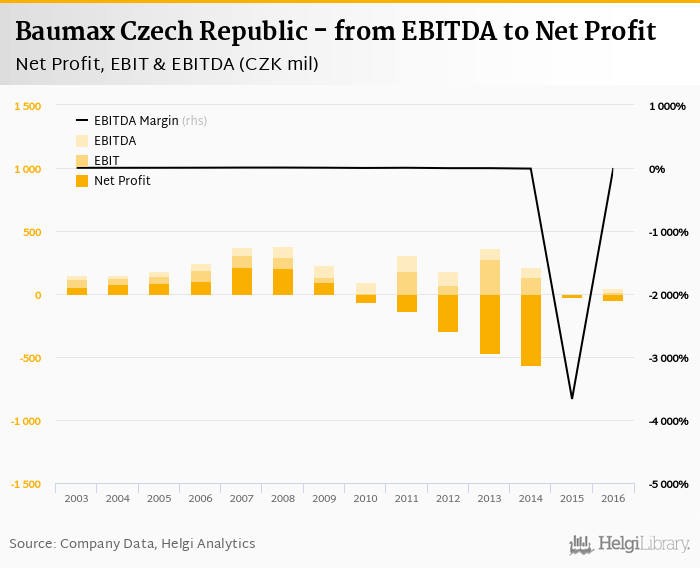 As far as Baumax Czech Republic's peers are concerned, Hornbach Baumarkt Czech Republic posted net and EBITDA margin of 5.34% and 9.21%, respectively in 2016, OBI Czech Republic generated margins of 5.80% and 9.60% and Mountfield profit margin reached 2.04% on the net and 6.98% on the EBITDA level in 2019.