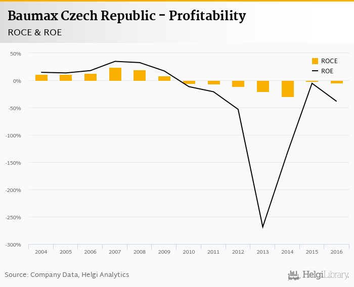 As far as Baumax Czech Republic's peers are concerned, Hornbach Baumarkt Czech Republic generated ROE of 14.7% and ROCE of 11.6% in 2016. OBI Czech Republic's profitability reached 19.3% and 20.5%, respectively. Mountfield operated with 22.2% and 4.75% returns in 2016.