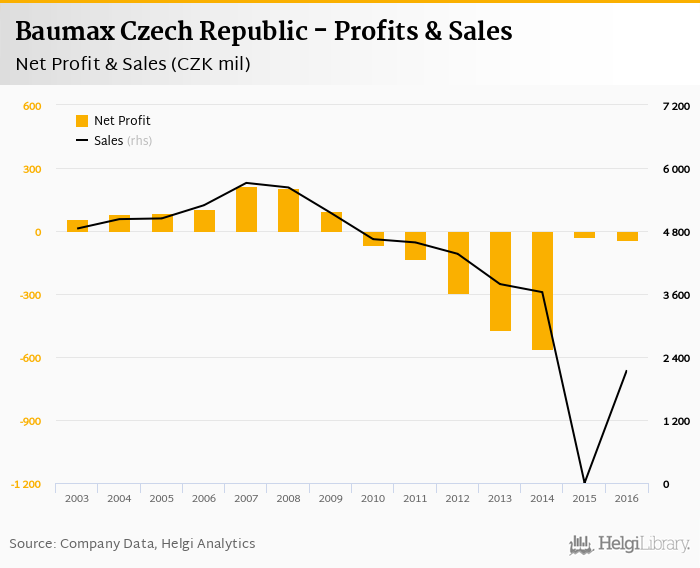 Baumax Czech Republic made a net profit of CZK -44.4 mil in 2016, down 67.1% compared to the previous year. Total sales reached CZK 2,150 mil, which is up 322% when compared to the previous year.