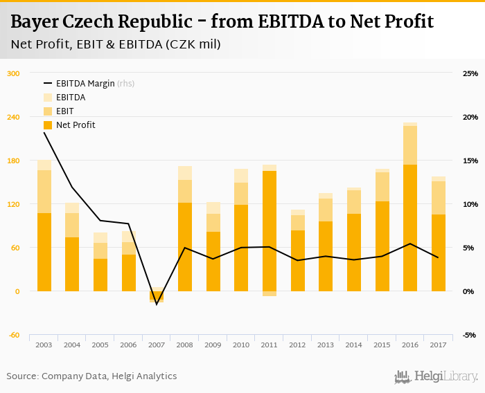 Bayer Czech Republic made a net profit of CZK 106 mil with revenues of CZK 4,180 mil in 2017, down by 39.4% and down by 3.37%, respectively, compared to the previous year. This translates into a net margin of 2.53%.