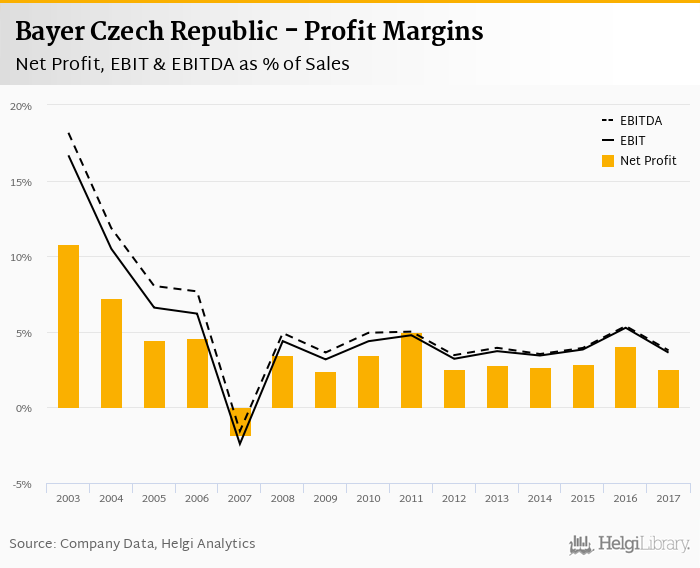 Bayer Czech Republic made a net profit of CZK 106 mil with revenues of CZK 4,180 mil in 2017, down by 39.4% and down by 3.37%, respectively, compared to the previous year.