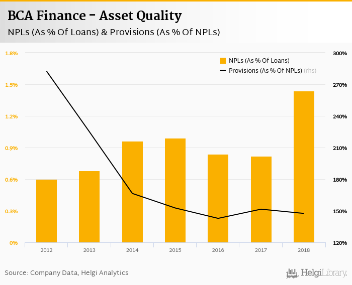 BCA Finance's non-performing loans reached 1.44% of total loans at the end of 2018, up from 0.820% compared to the previous year. Historically, the NPL ratio hit an all time high of 1.44% in 2018 and an all time low of 0.600% in 2012.