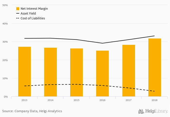 Average asset yield was 33.1% in 2018, up from 31.0% when compared to previous year. On the other hand, cost of funding amounted to 2.83% in 2018, down from 4.64%.