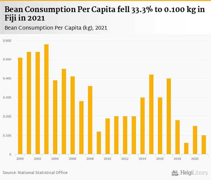 Bean consumption per capita fell 33.3% to 0.100 kg in Fiji in 2021, according to Faostat.