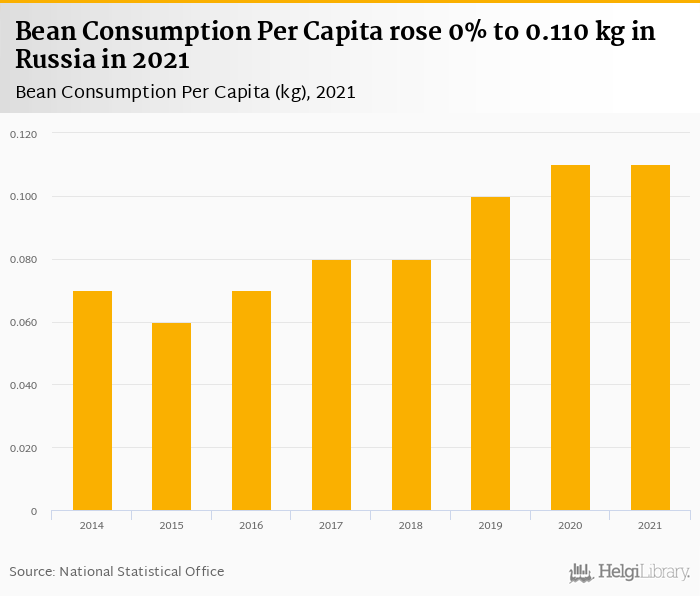 Bean consumption per capita rose 0% to 0.110 kg in Russia in 2021, according to Faostat.