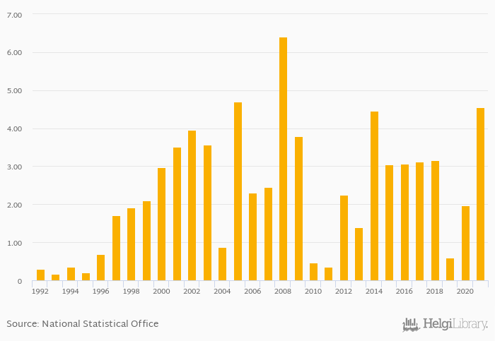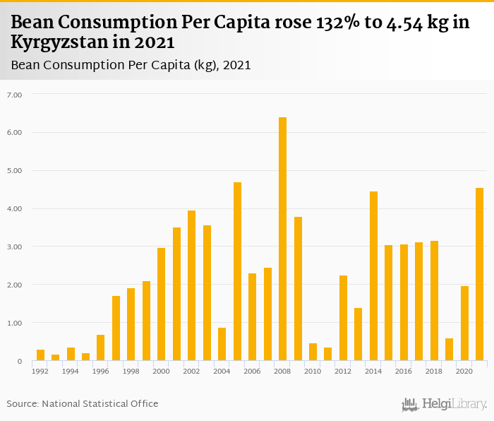 Bean consumption per capita rose 132% to 4.54 kg in Kyrgyzstan in 2021, according to Faostat.