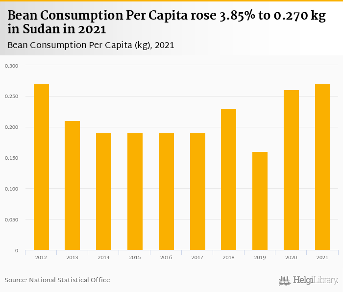 Bean consumption per capita rose 3.85% to 0.270 kg in Sudan in 2021, according to Faostat.