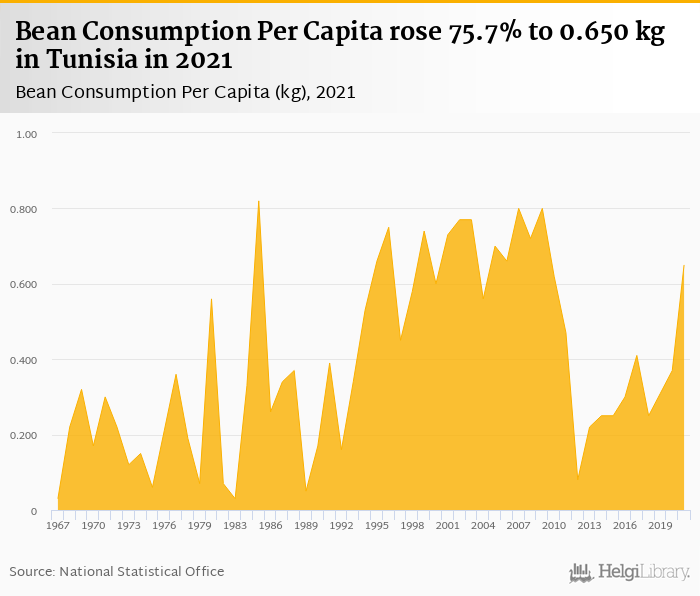 Bean consumption per capita rose 75.7% to 0.650 kg in Tunisia in 2021, according to Faostat.