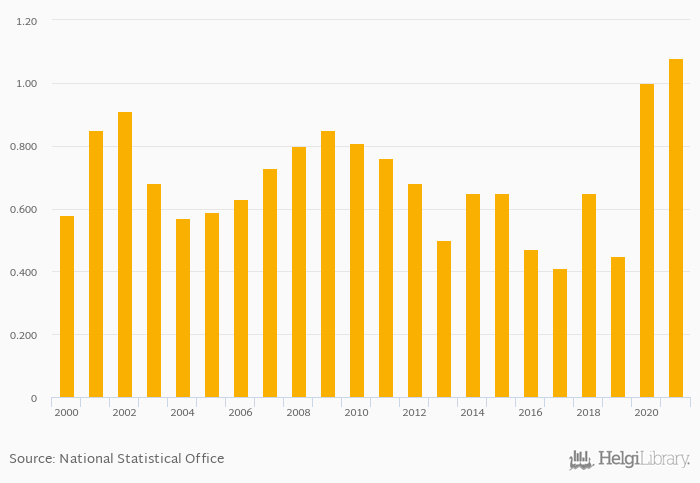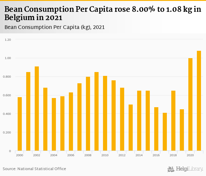 Bean consumption per capita rose 8.00% to 1.08 kg in Belgium in 2021, according to Faostat.