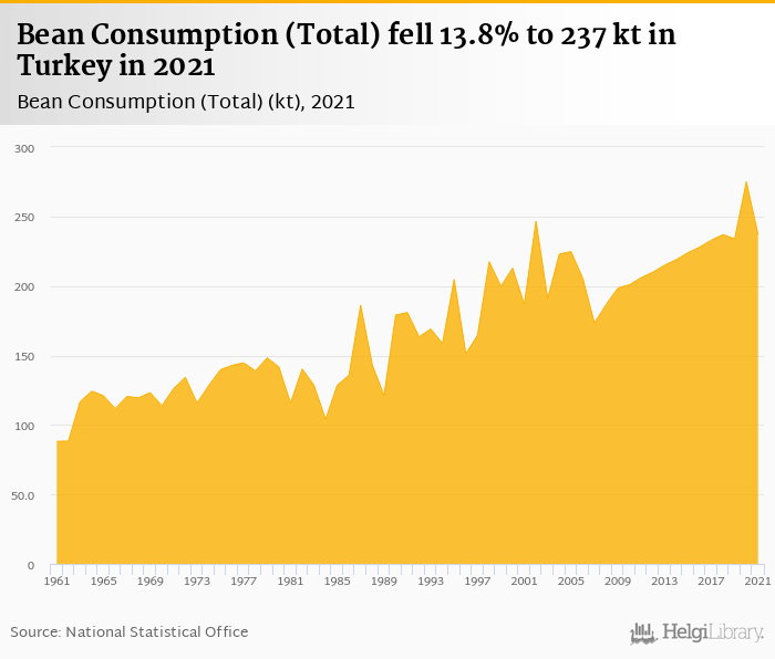 Total bean consumption fell 13.8% to 237 kt in Turkey in 2021, according to Faostat.