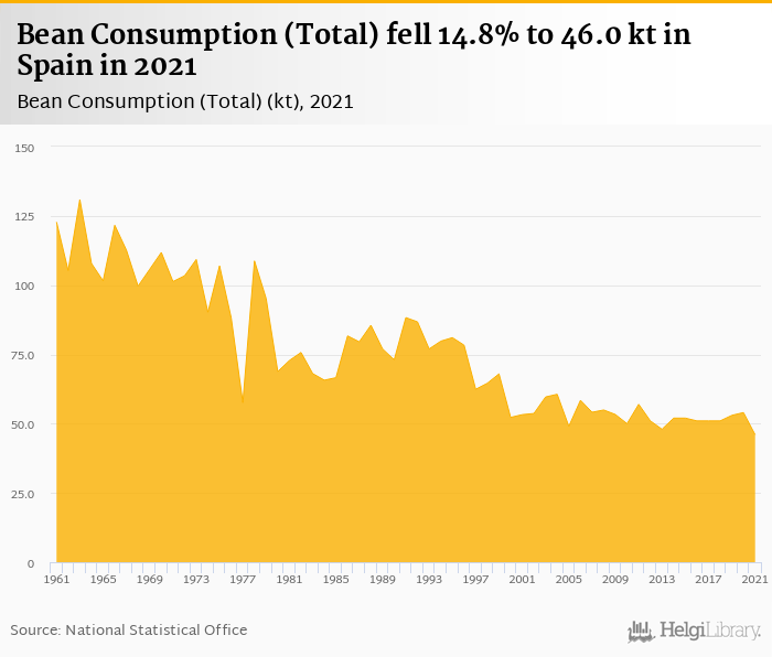 Total bean consumption fell 14.8% to 46.0 kt in Spain in 2021, according to Faostat.