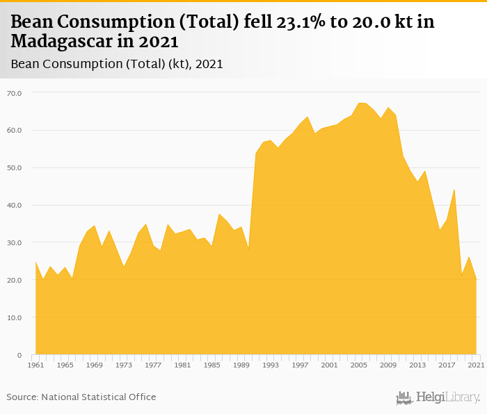 Total bean consumption fell 23.1% to 20.0 kt in Madagascar in 2021, according to Faostat.