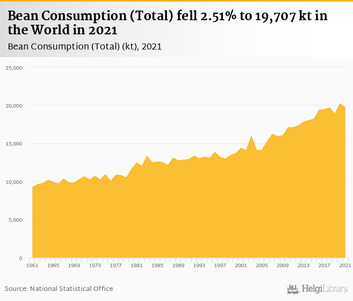 Total bean consumption fell 2.51% to 19,707 kt in the World in 2021, according to Faostat.