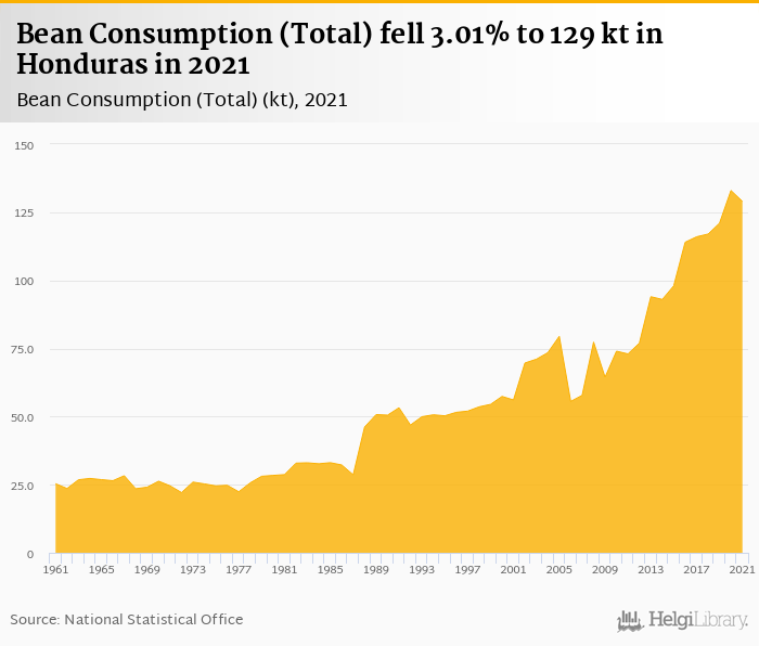 Total bean consumption fell 3.01% to 129 kt in Honduras in 2021, according to Faostat.