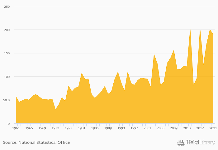 Historically, total bean consumption in Venezuela reached an all time high of 201 kt in 2017 and an all time low of 29.6 kt in 1973. When compared to Venezuela's main peers, total bean consumption in Brazil amounted to 2,572 kt, 115 kt in Colombia, 1.00 kt in Guyana and 1.00 kt in Trinidad and Tobago in 2021.