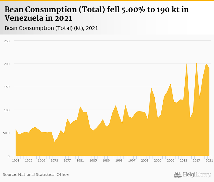 Total bean consumption fell 5.00% to 190 kt in Venezuela in 2021, according to Faostat.