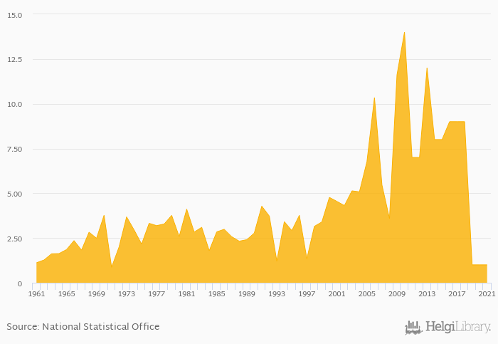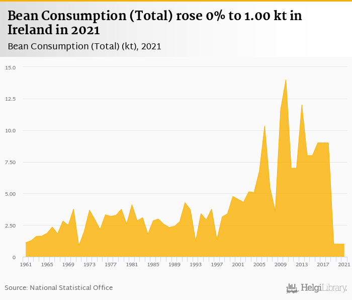 Historically, total bean consumption in Ireland reached an all time high of 14.0 kt in 2010 and an all time low of 0.864 kt in 1971.