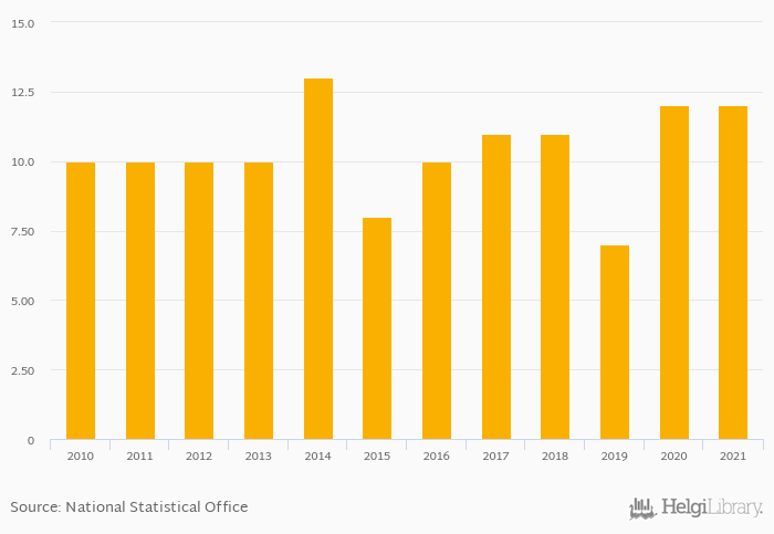 Historically, total bean consumption in Moldova reached an all time high of 13.0 kt in 2014 and an all time low of 7.00 kt in 2019. When compared to Moldova's main peers, total bean consumption in Bulgaria amounted to 8.00 kt, 28.0 kt in Romania, 15.0 kt in Russia and 71.0 kt in Ukraine in 2021.