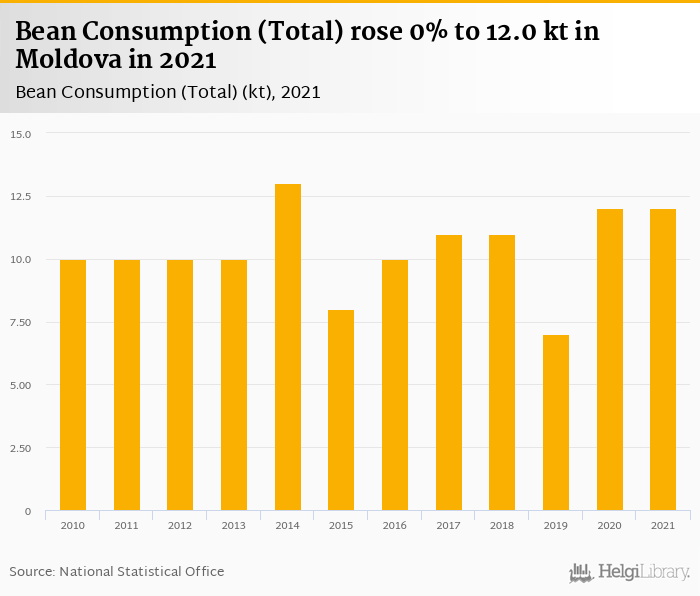 Total bean consumption rose 0% to 12.0 kt in Moldova in 2021, according to Faostat.