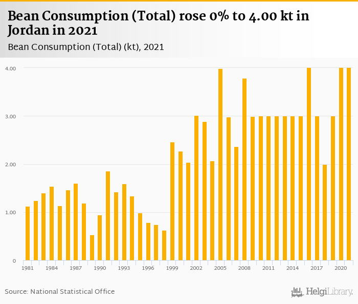 Total bean consumption rose 0% to 4.00 kt in Jordan in 2021, according to Faostat.