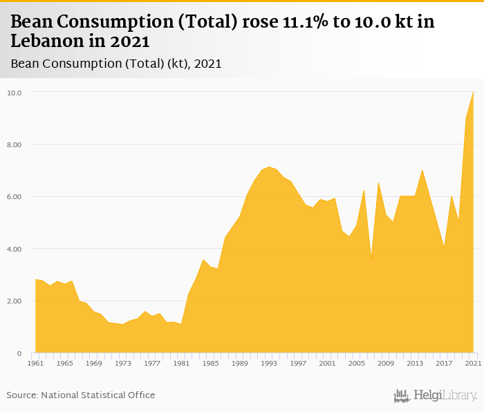 Total bean consumption rose 11.1% to 10.0 kt in Lebanon in 2021, according to Faostat.