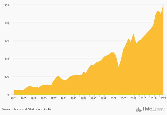 Historically, total bean consumption in Tanzania reached an all time high of 999 kt in 2021 and an all time low of 44.0 kt in 1963. When compared to Tanzania's main peers, total bean consumption in Kenya amounted to 427 kt, 85.0 kt in Mozambique, 603 kt in Uganda and 1.00 kt in Zambia in 2021.
