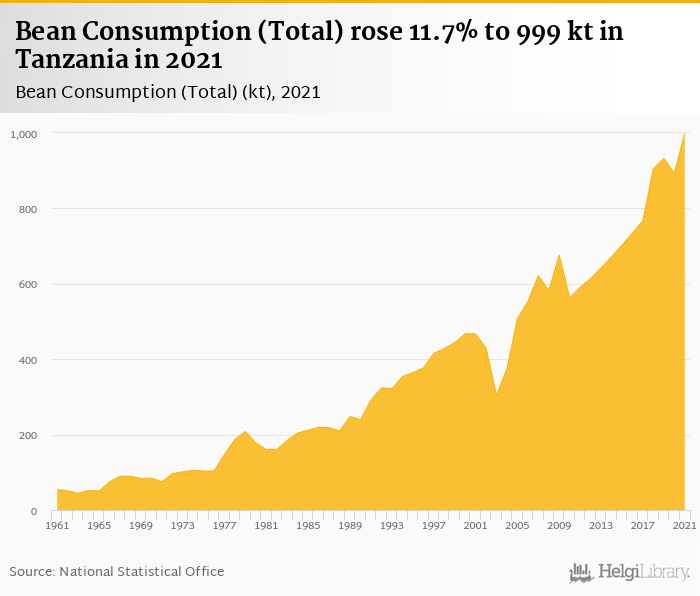 Total bean consumption rose 11.7% to 999 kt in Tanzania in 2021, according to Faostat.