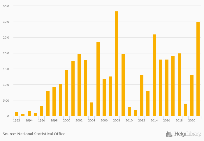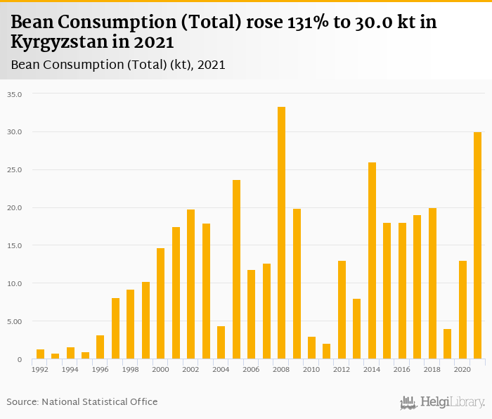 Total bean consumption rose 131% to 30.0 kt in Kyrgyzstan in 2021, according to Faostat.