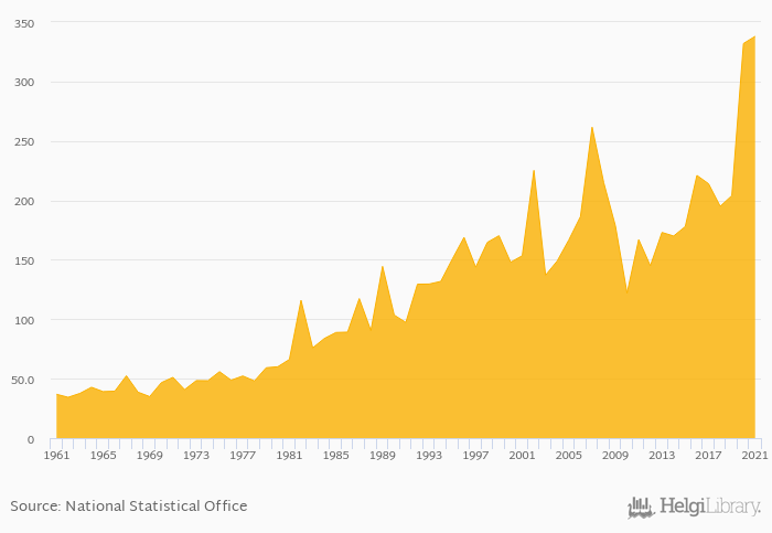 Historically, total bean consumption in Pakistan reached an all time high of 338 kt in 2021 and an all time low of 34.3 kt in 1962.