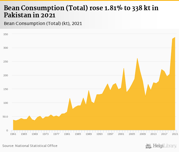 Total bean consumption rose 1.81% to 338 kt in Pakistan in 2021, according to Faostat.
