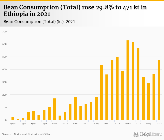 Total bean consumption rose 29.8% to 471 kt in Ethiopia in 2021, according to Faostat.