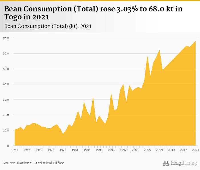 Total bean consumption rose 3.03% to 68.0 kt in Togo in 2021, according to Faostat.