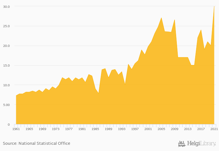 Historically, total bean consumption in Nepal reached an all time high of 30.0 kt in 2021 and an all time low of 7.25 kt in 1961. When compared to Nepal's main peers, total bean consumption in Bangladesh amounted to 64.0 kt, 1.00 kt in Bhutan, 379 kt in China and 5,275 kt in India in 2021.