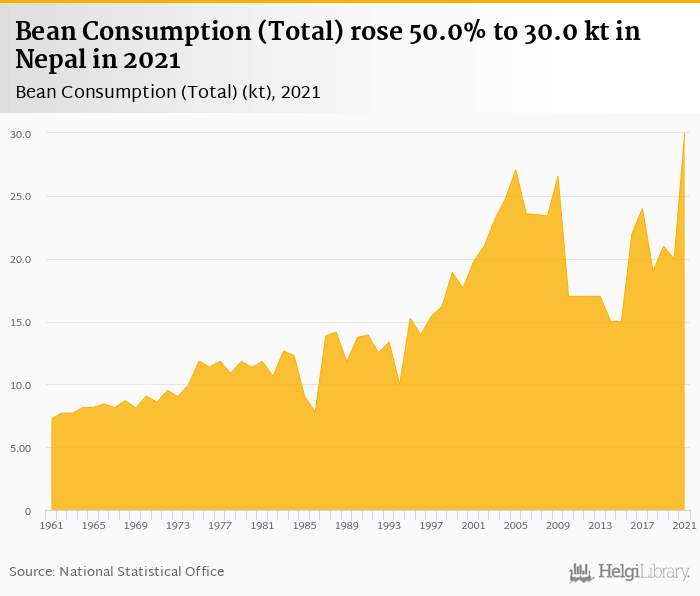 Total bean consumption rose 50.0% to 30.0 kt in Nepal in 2021, according to Faostat.