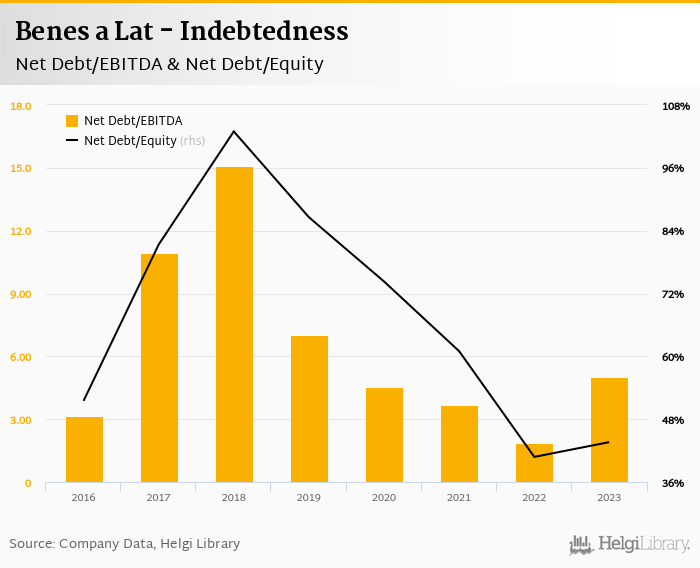 Benes a Lat's net debt stood at CZK 165 mil and accounted for 43.6% of equity at the end of 2023. The ratio is up 2.83 pp compared to the previous year.