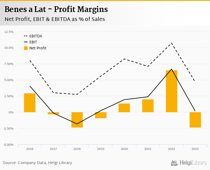 Benes a Lat made a net profit of CZK -16.7 mil with revenues of CZK 706 mil in 2023, down by 131% and down by 14.4%, respectively, compared to the previous year.