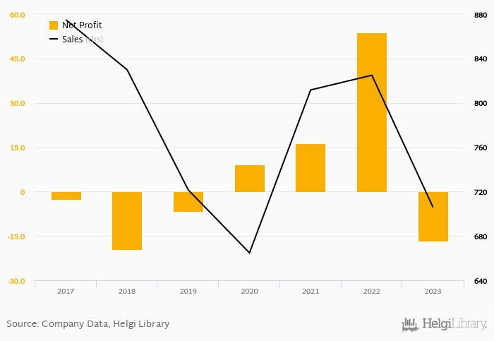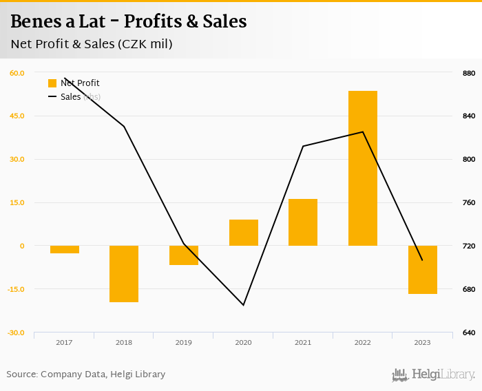 Benes a Lat made a net profit of CZK -16.7 mil in 2023, down 131% compared to the previous year. Total sales reached CZK 706 mil, which is down 14.4% when compared to the previous year.