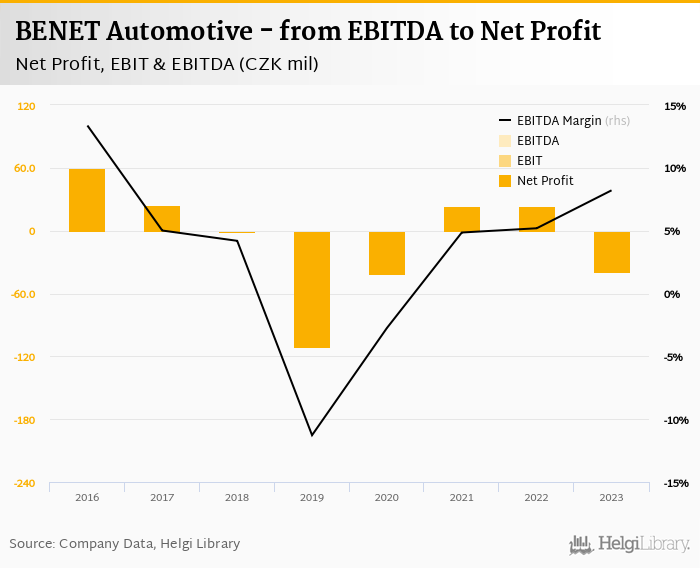BENET Automotive made a net profit of CZK -39.5 mil with revenues of CZK 1,035 mil in 2023, down by 268% and up by 45.6%, respectively, compared to the previous year. This translates into a net margin of -3.81%.