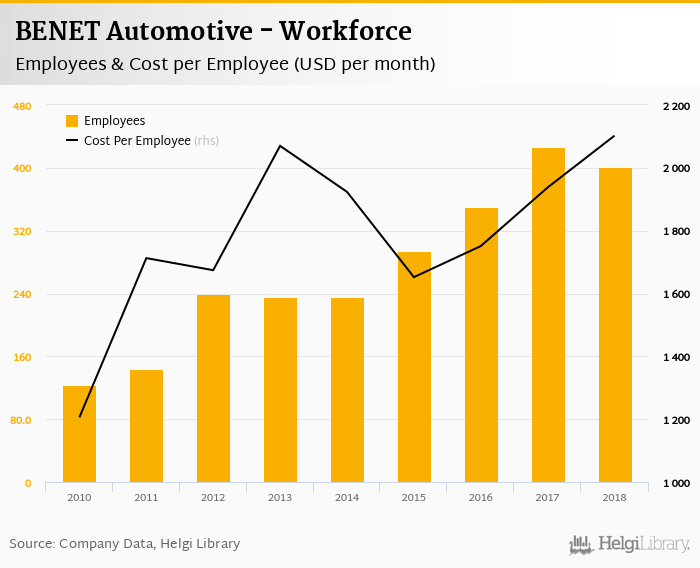 BENET Automotive employed 401 employees in 2018, down 5.87% compared to the previous year. Historically, between 2010 and 2018, the firm's workforce hit a high of 426 employees in 2017 and a low of 123 employees in 2010.