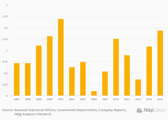 Historically, bentonite production in Chile reached an all time high of 1.70 kt in 2001 and an all time low of 0.101 kt in 2004.